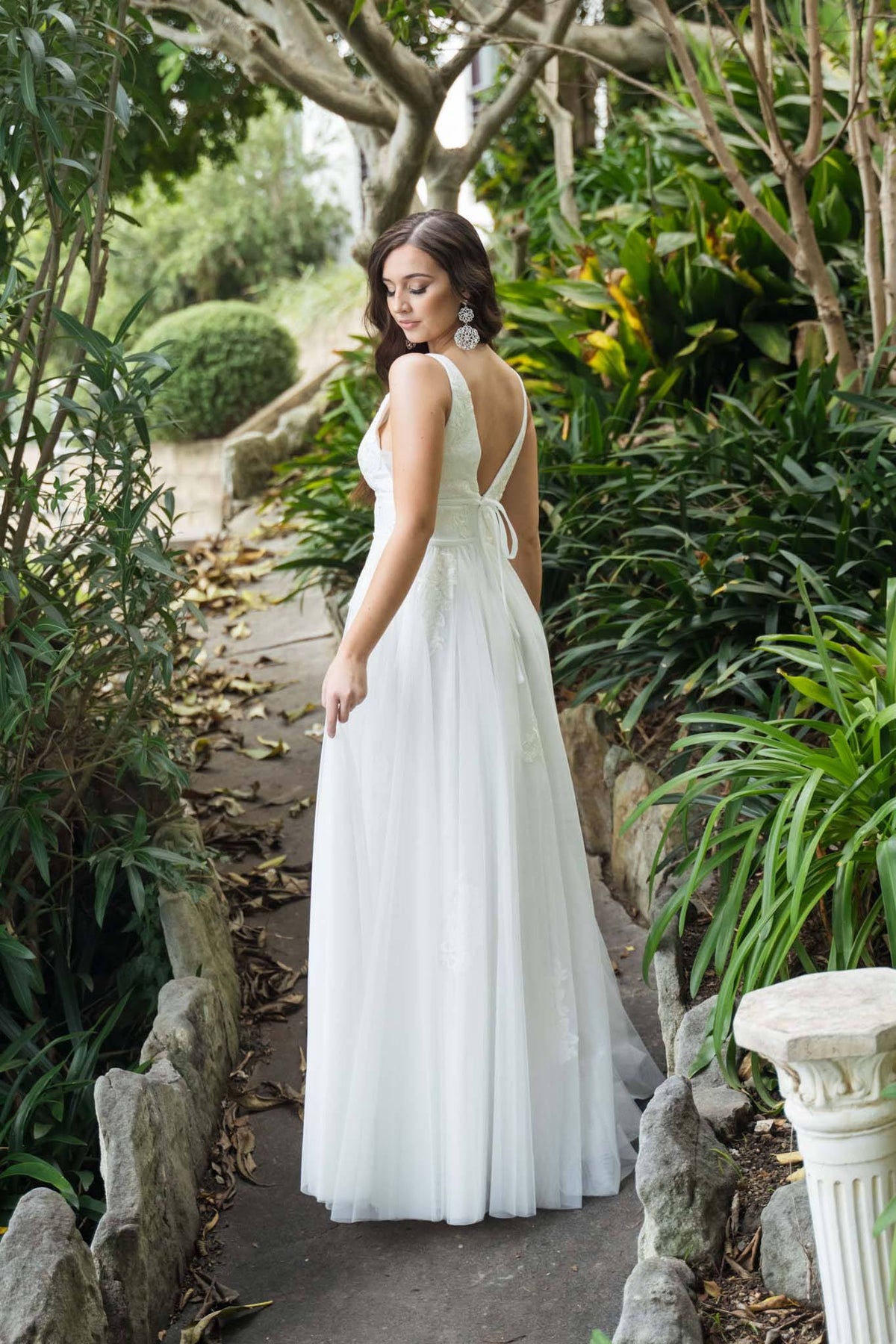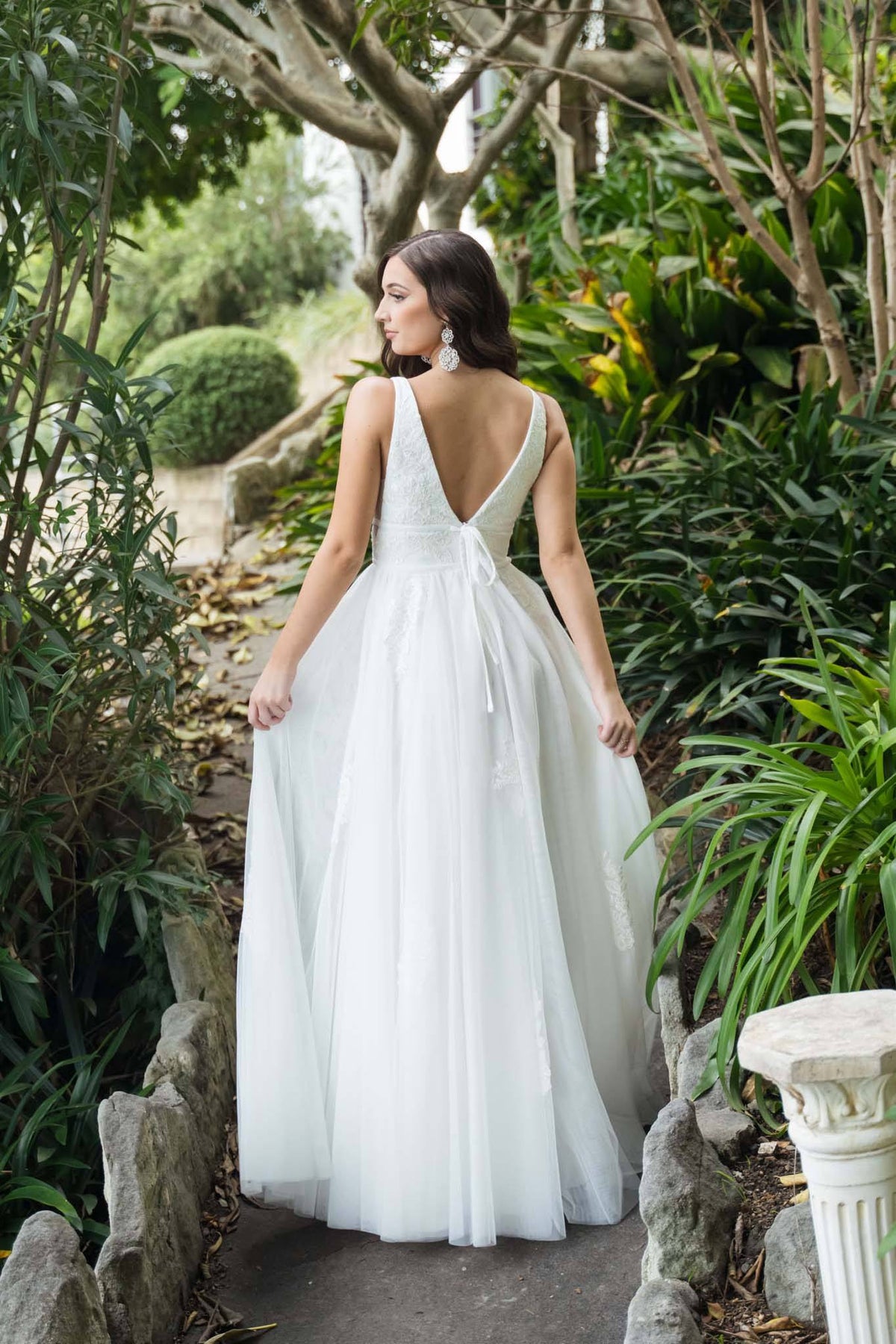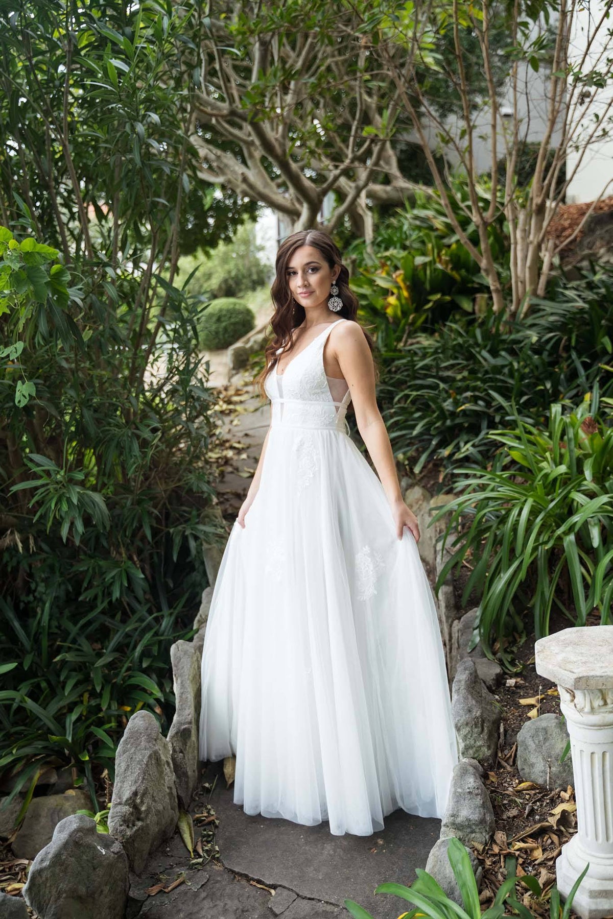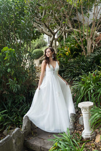 The Rosana wedding gown features embroidered floral lace details, illusion plunging V neckline, open back, double waist strap detail and a long tulle A line skirt. This beauty is perfect for the romantic bride.