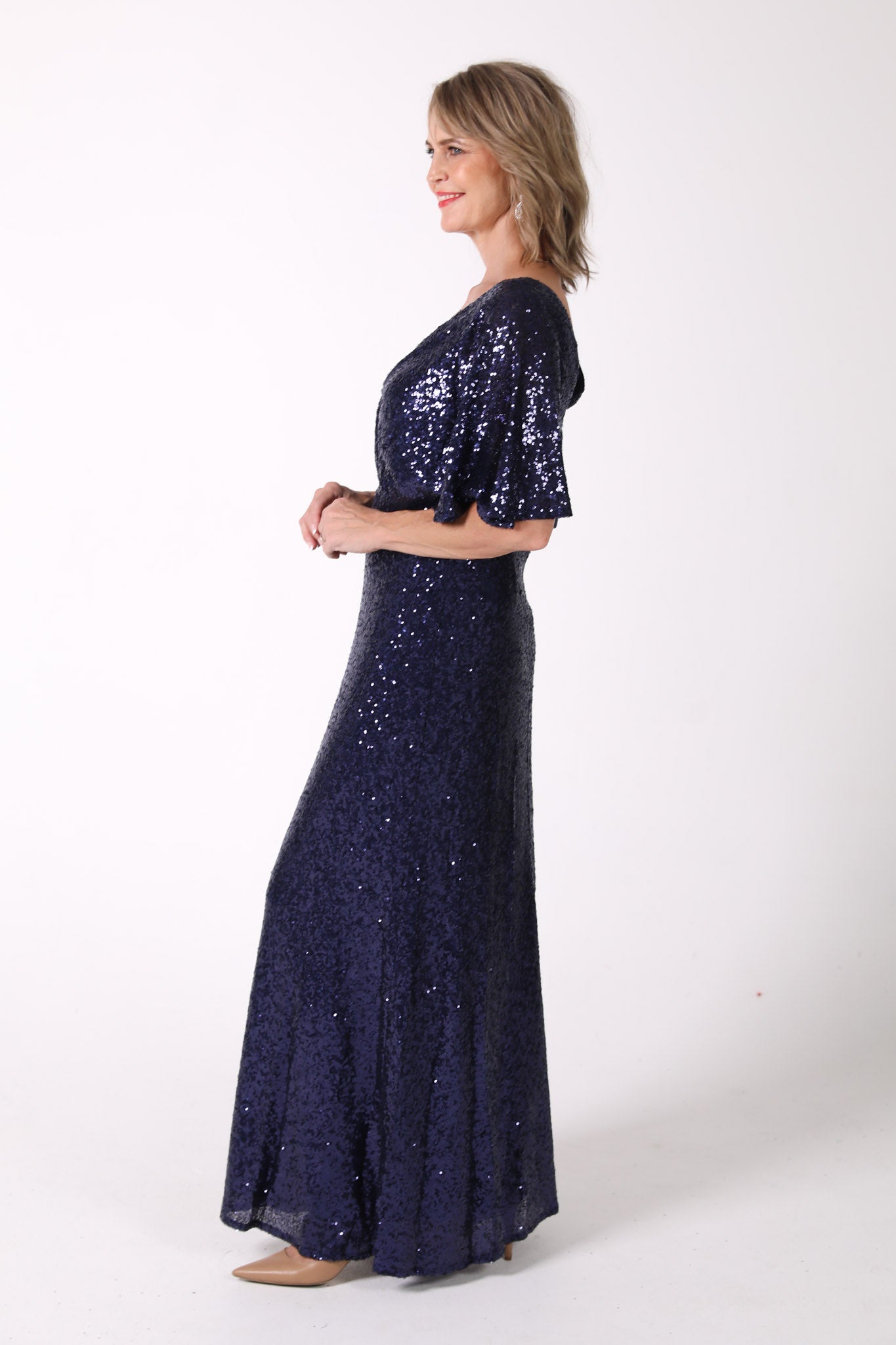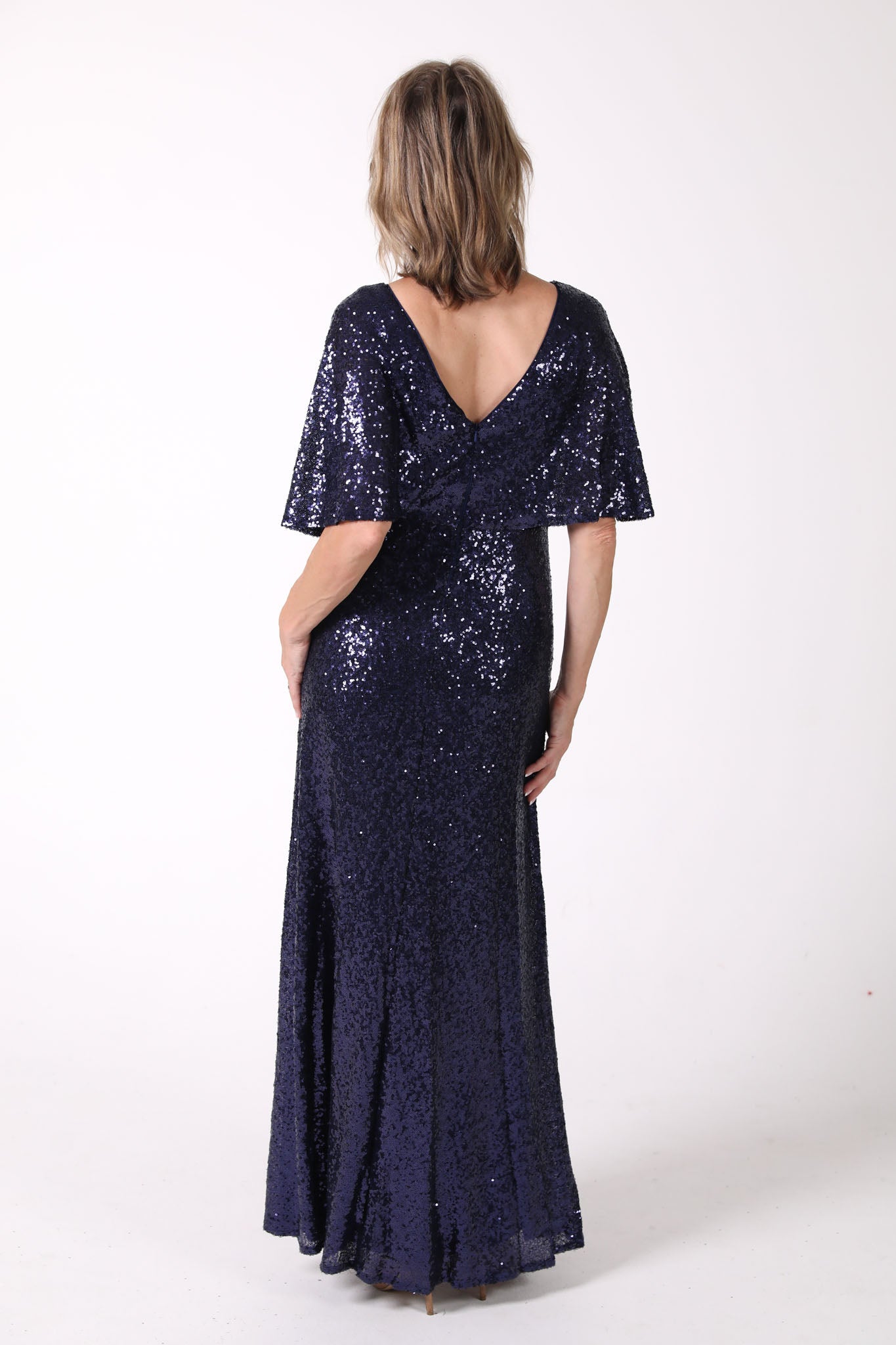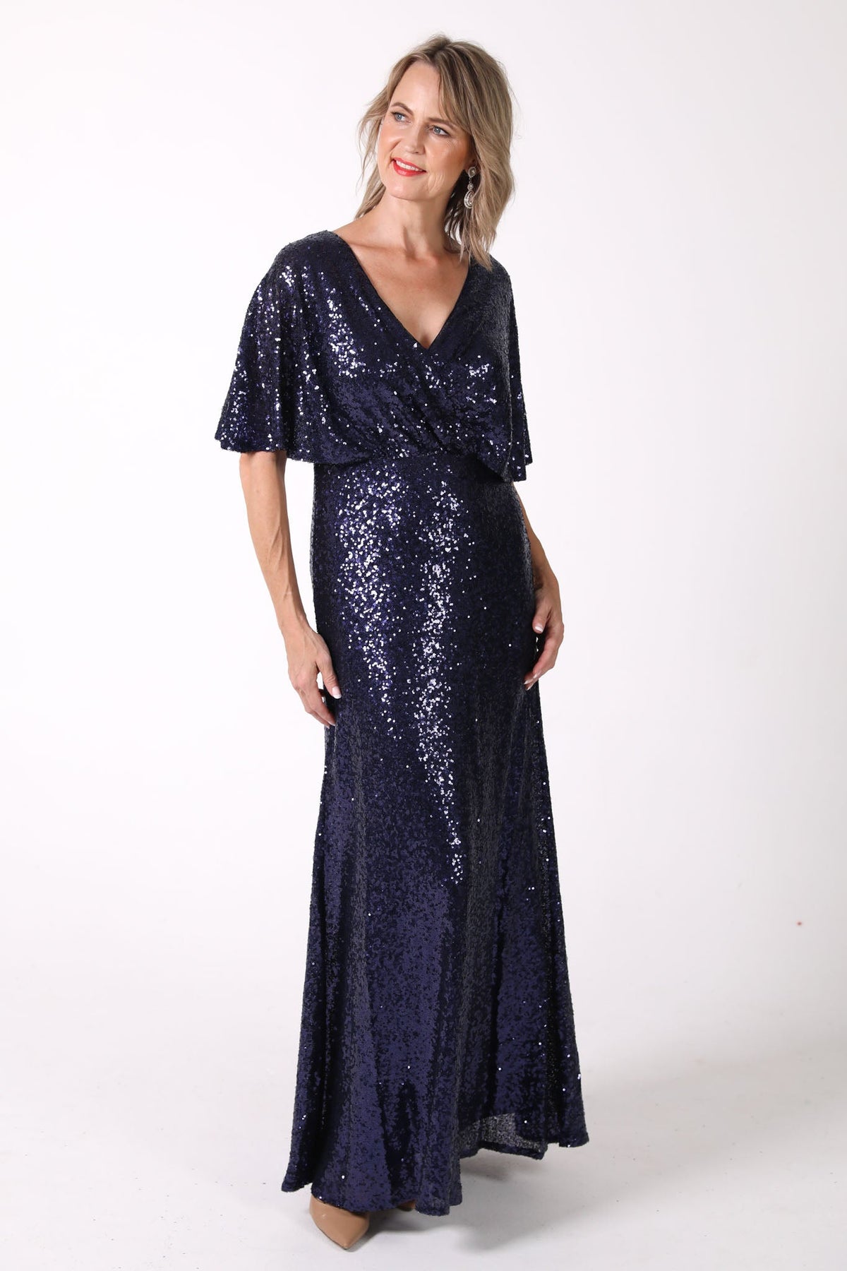The Martha sequin maxi dress in navy features beautiful butterfly sleeve design. The deep blue sequins radiate subtle shine which is perfect for Black Tie, Gala, Mother of The Bride/Groom or Bridesmaids. Style it with drop earrings and pumps or muted mules for a flawless finish.