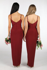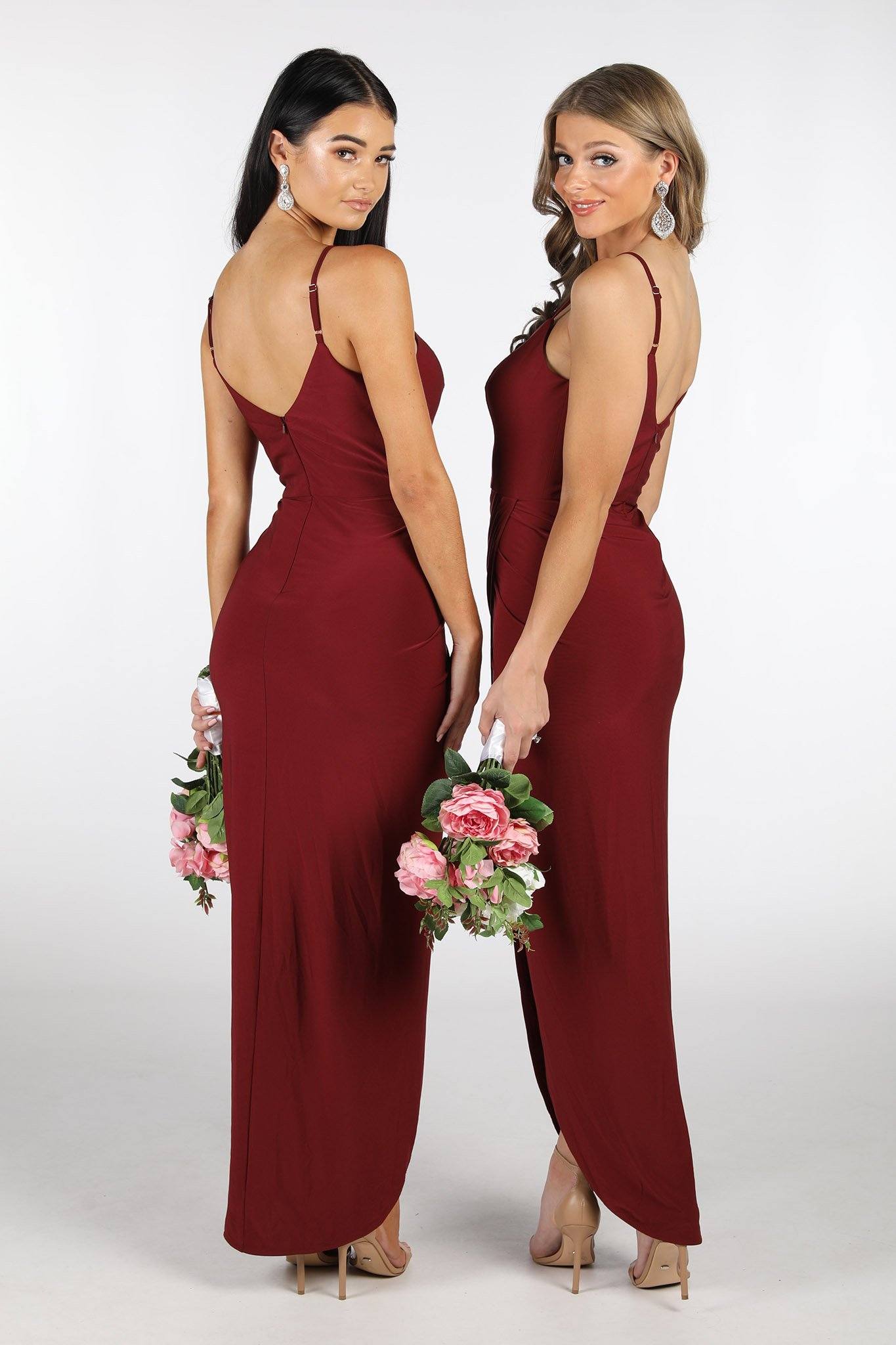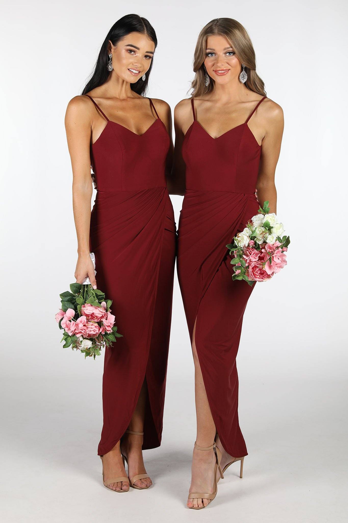 The lovely Leah dress features flattering faux-wrap front with two adjustable spaghetti straps and asymmetrical skirt. Fitted throughout the bodice and hugs the hips and flows down to the calf just above the ankle, this dress to perfect for bridesmaids and all occasions.