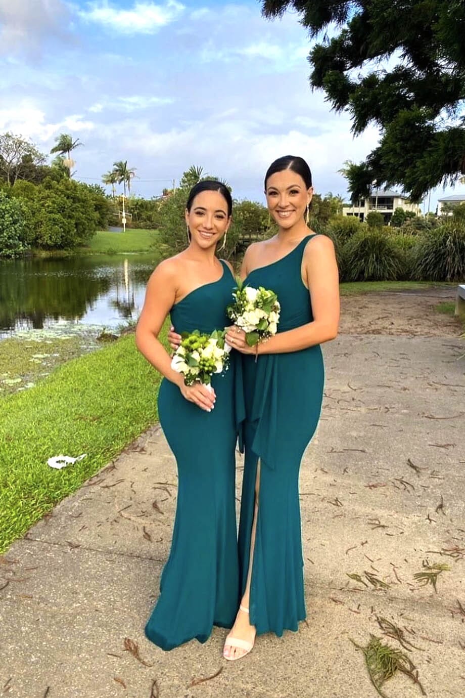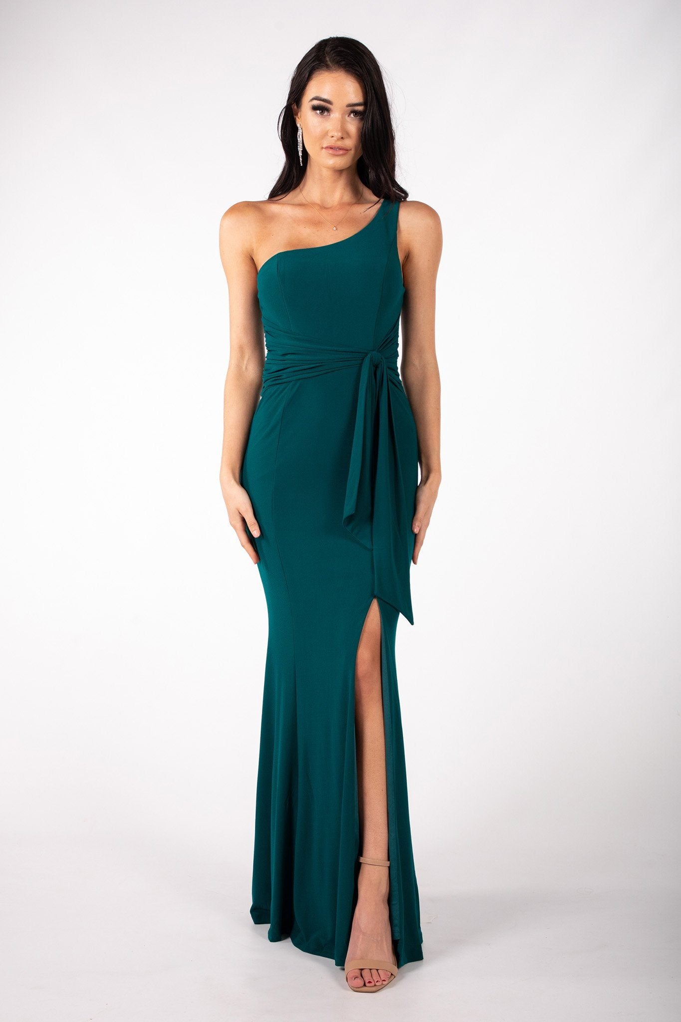 ABIGAIL one shoulder maxi dress features asymmetrical neckline, a bodycon fit with waist tie detail, thigh-high slit and a column styled silhouette. This gorgeous one shoulder formal dress is perfect for bridesmaids, wedding guests, red carpets or any special formal occasion.