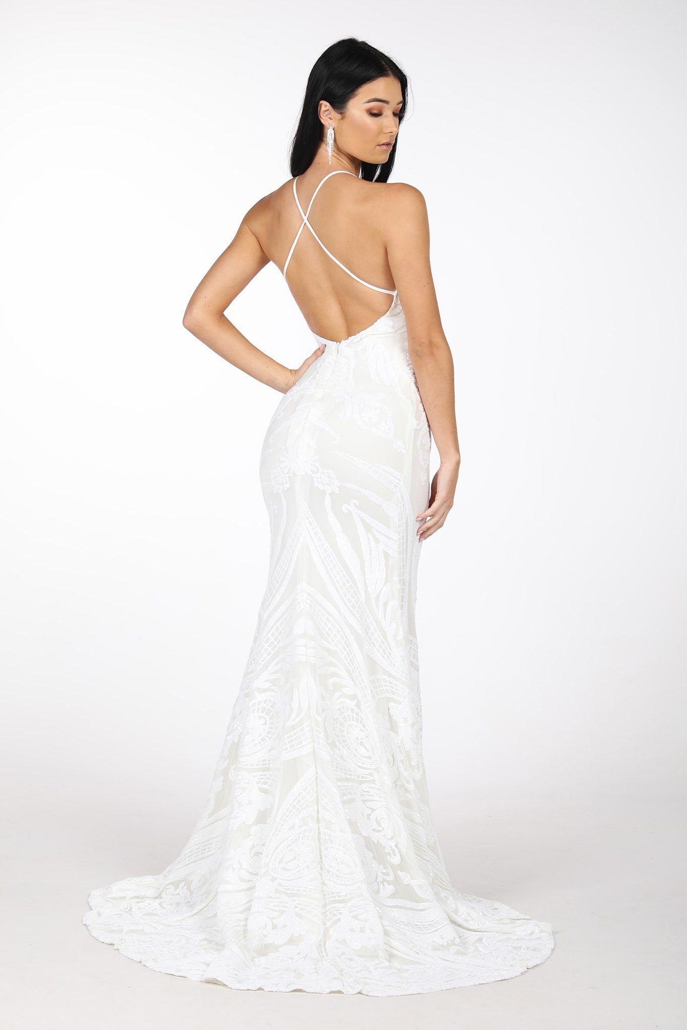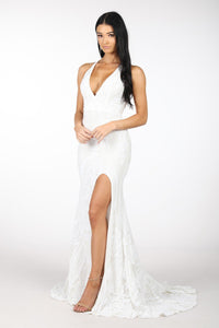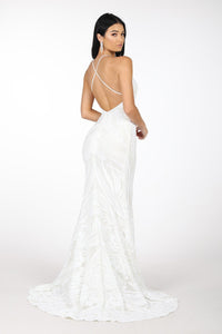 Ariella Side Slit Pattern Sequin Gown - White (M - Clearance Sale)