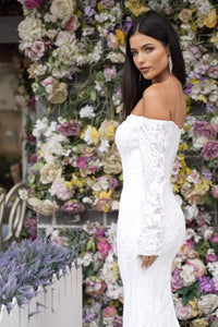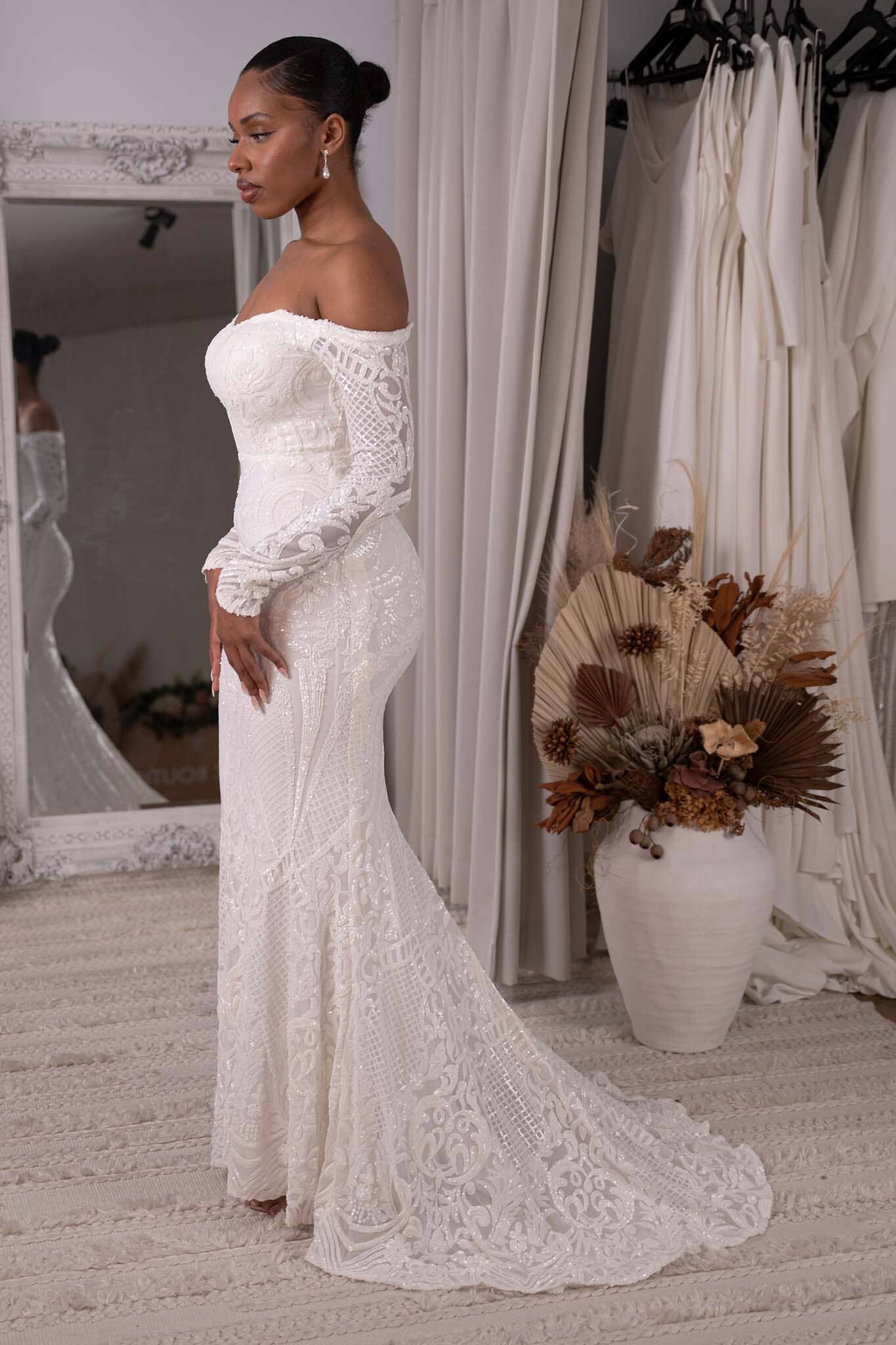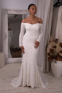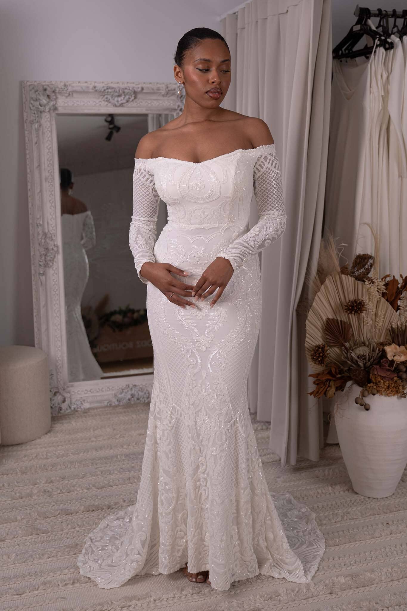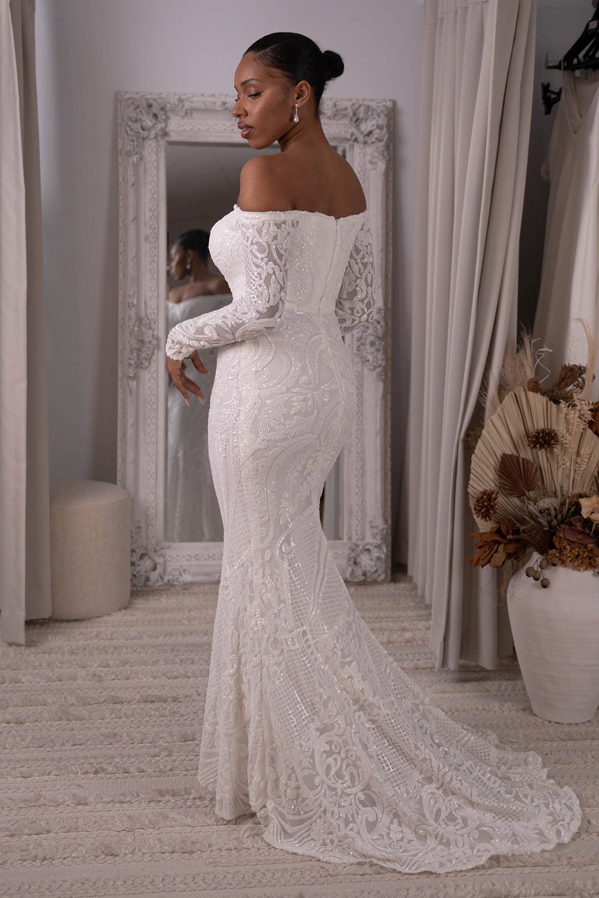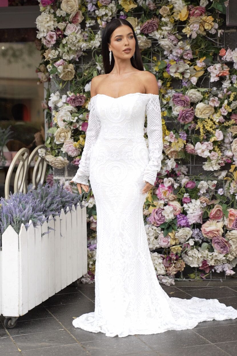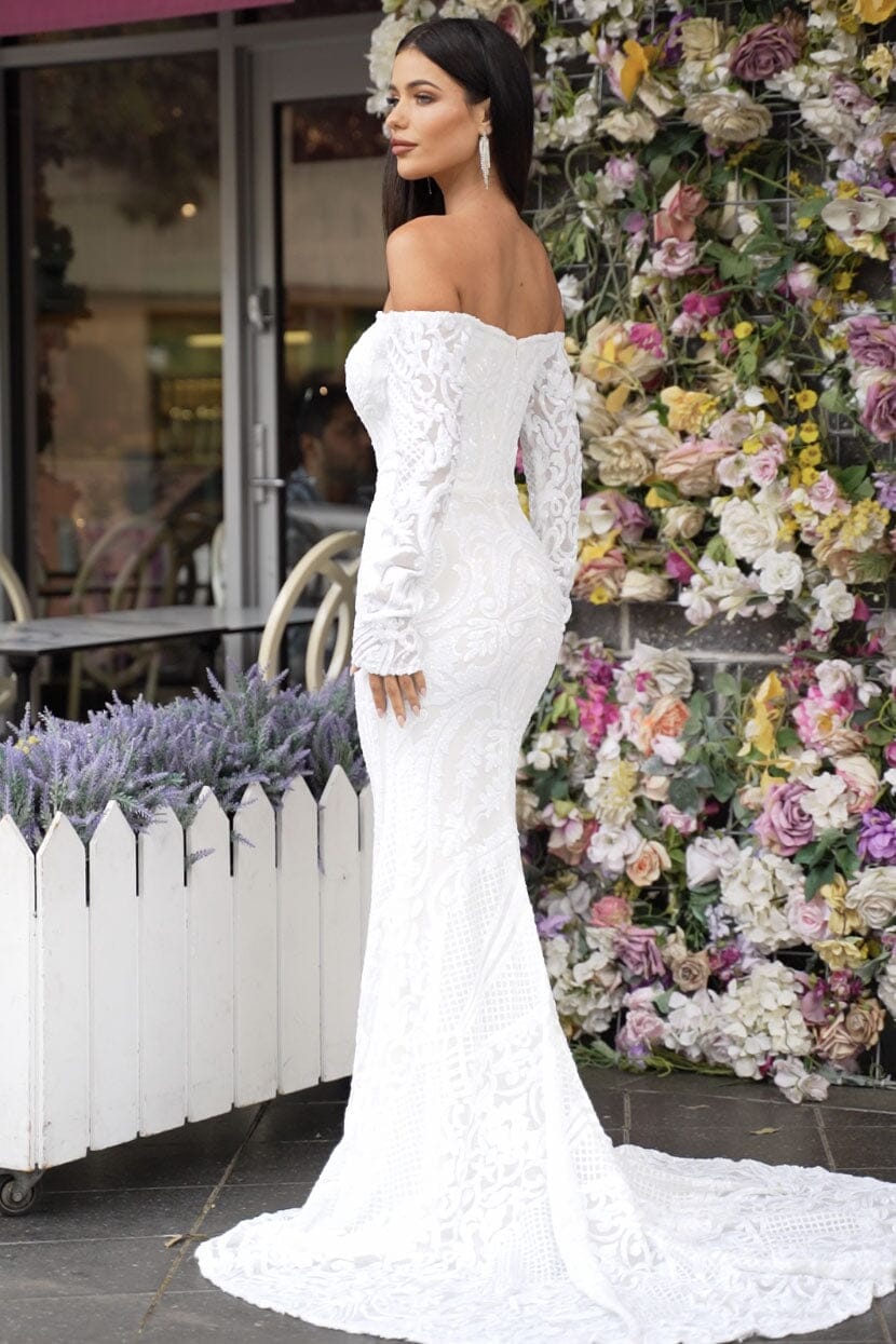 GIANNA with off-the-shoulder long sleeves is perfect for a modern bride who wants a classic, minimalist and timeless design. Featuring white embroidered pattern sequins over white underlay and striking figure-hugging fit and flare silhouette. This incredibly flattering gown will turn heads walking down the aisle or at any formal event.