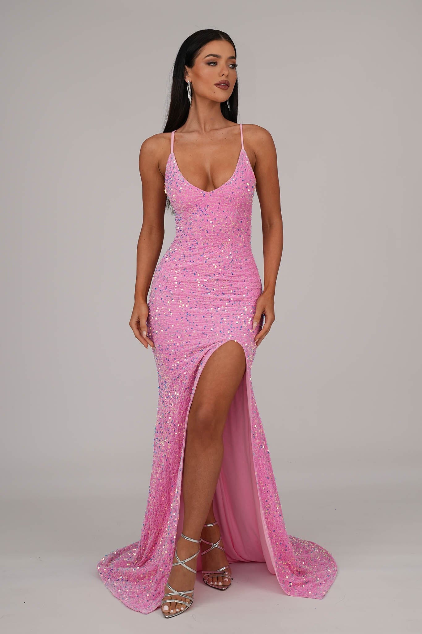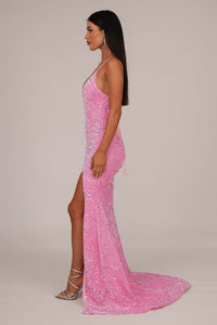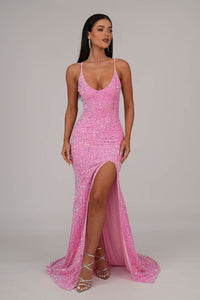 Zelda Side Slit Velvet Sequin Gown - Pink