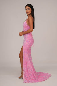 Zelda features sumptuous velvet sequinned fabric, V neckline, adjustable lace up straps on open back, thigh-high side slit, and the most flattering fit and flare silhouette. Slip into this shimmery evening gown to have all eyes on you at prom, school formal or any formal event.
