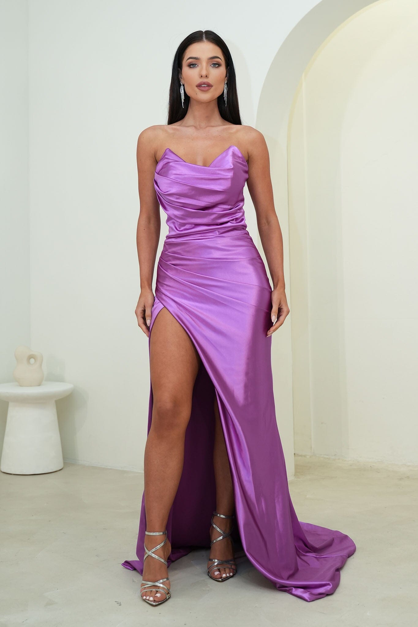 Martina features a classic strapless neckline, fitted bodice that gently flares into a sweep train with an elegant ruching detail and high side slit. Perfect for school formal or prom night, red carpet or any formal event.