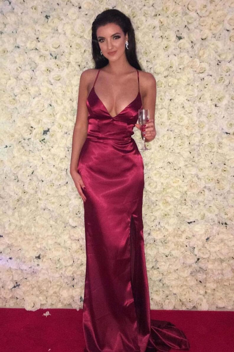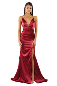 ELECTRA Lace Up Back Front Slit Satin Gown - Deep Red