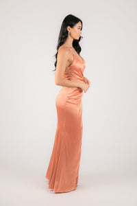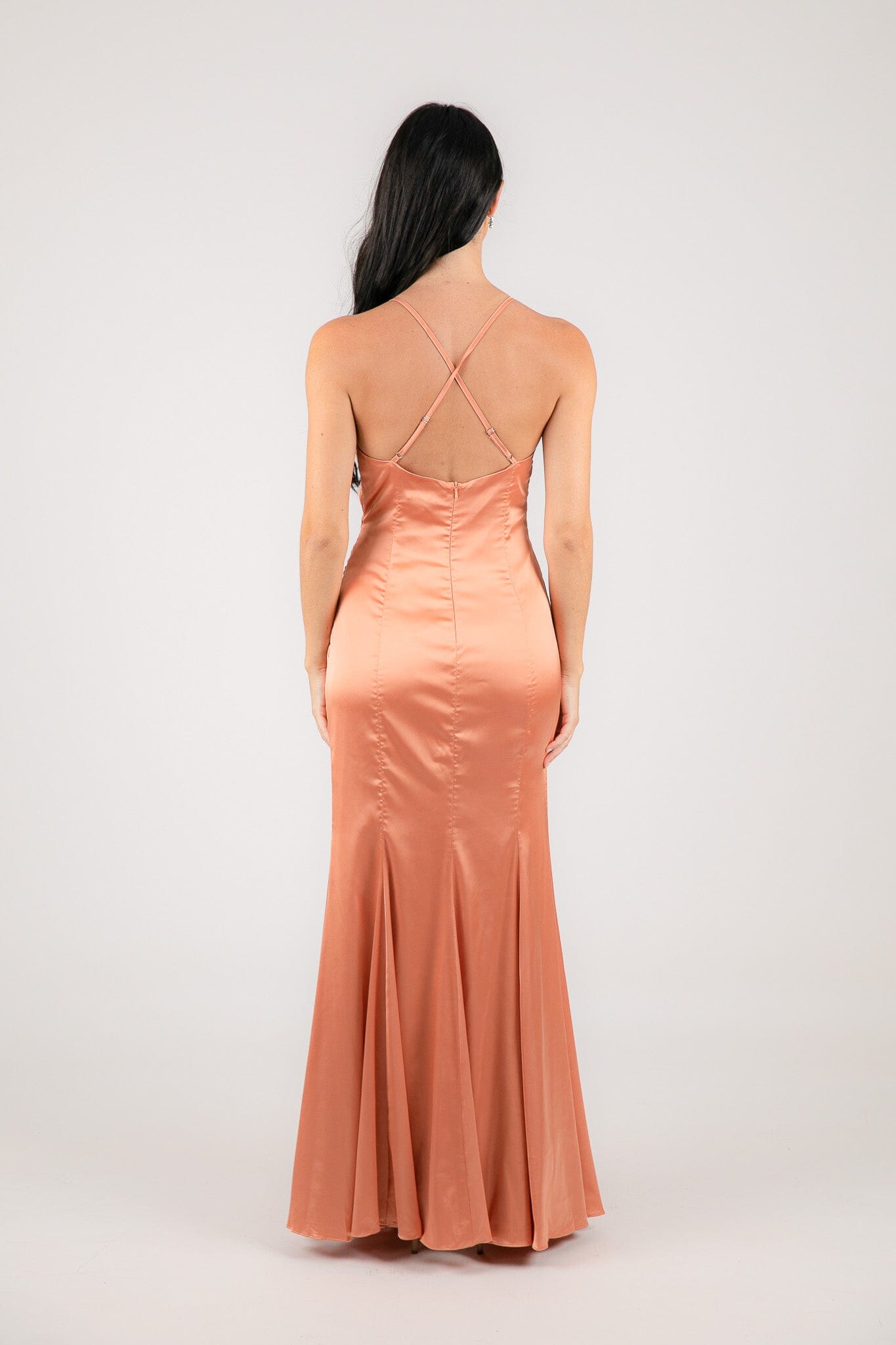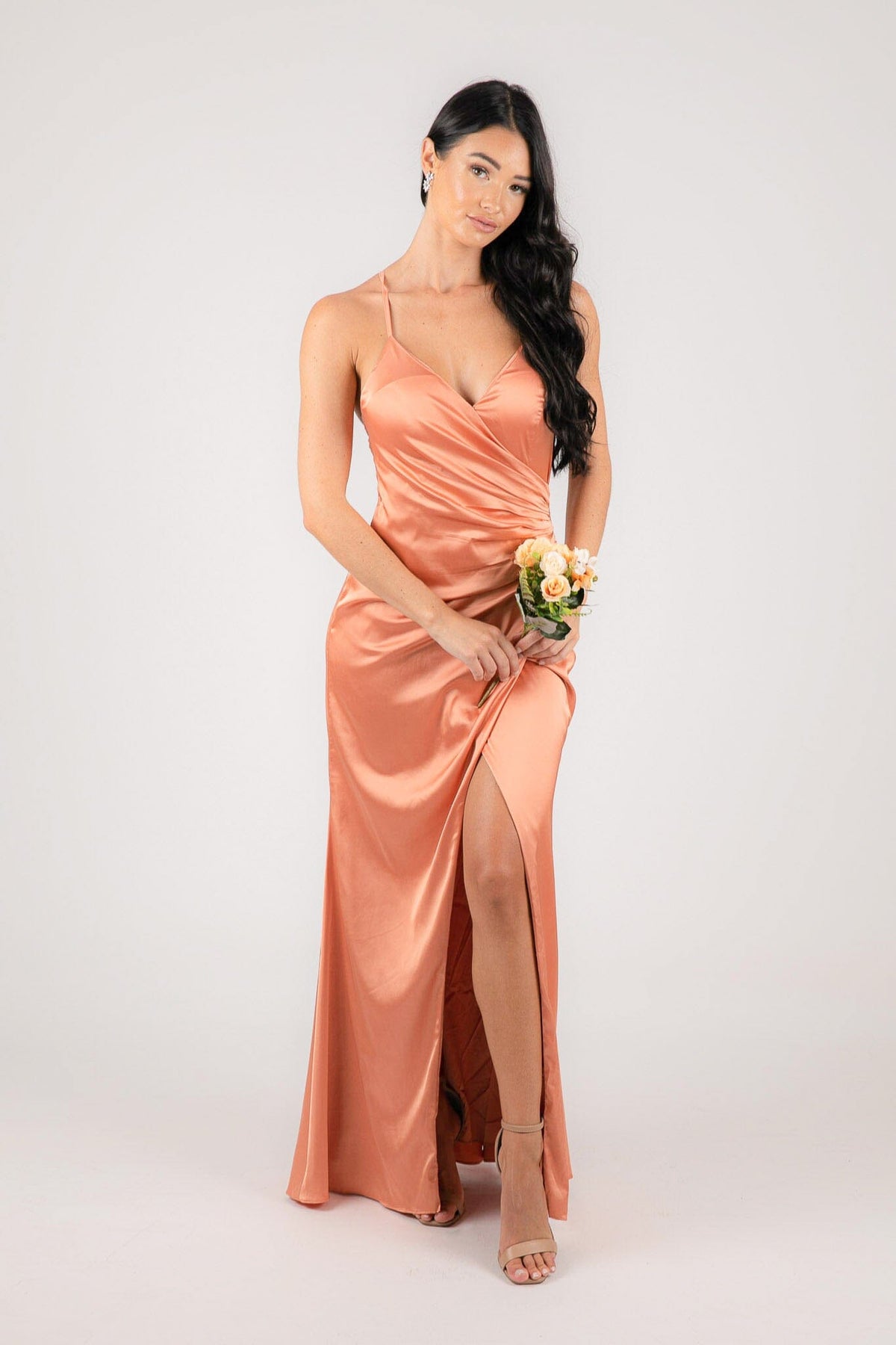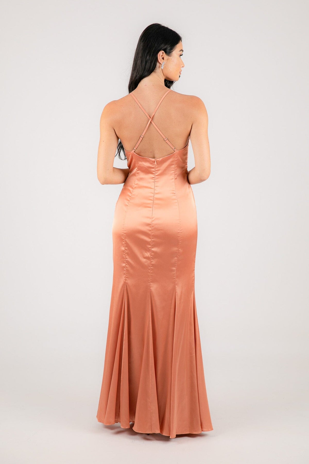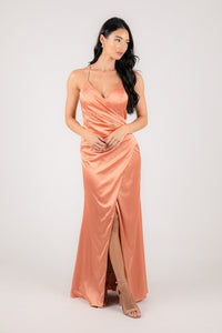 The lovely BELINDA features V neckline, gathered waist and thigh-high slit. This gorgeous satin formal dress is perfect for rustic themed bridesmaids, wedding guests, black tie and other special occasions.