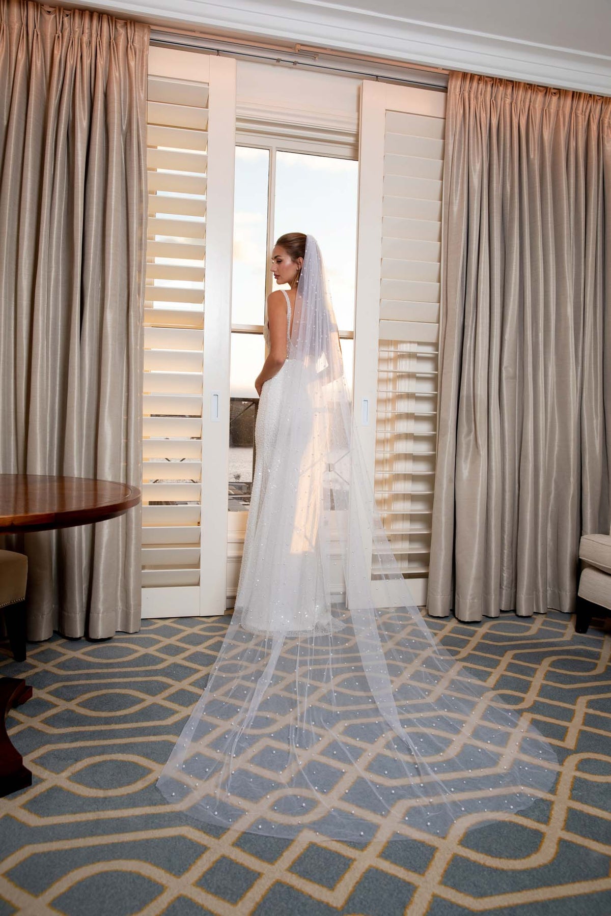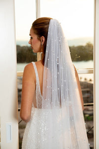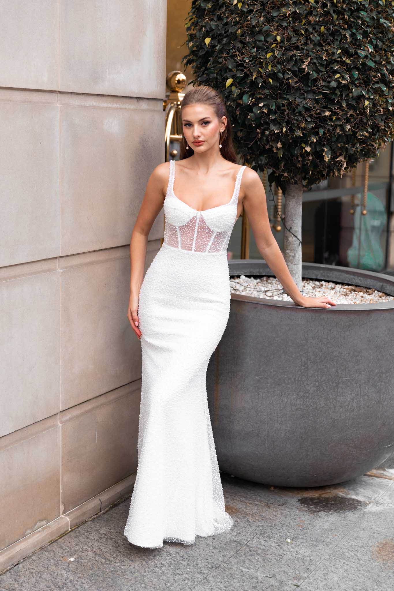 MILANA is a true head-turning wedding dress. Featuring a contemporary sheer corset bodice with a figure hugging Fit and Flare silhouette, making this gown both flattering and sophisticated. Crafted from shimmering embellished beadwork that subtly sparkles in every movement and the luxurious stretch crepe underlay that gives you a stunning form-fitting shape, you will be the unforgettable bride in this mesmerising show-stopper. MILANA is perfectly paired with our INES Pearl Veil to complete your bridal look.