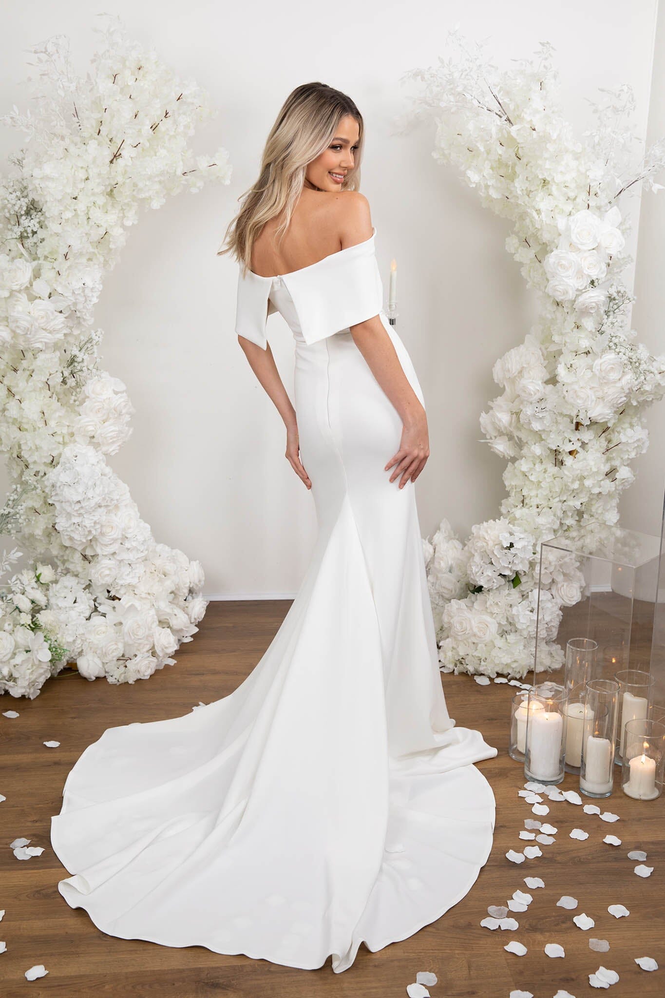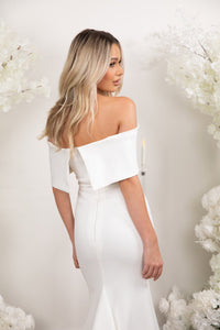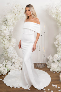 NYLA features a sophisticated off-shoulder design that beautifully frames the neckline. Crafted from double layer stretch scuba crepe material, her fit-and-flare silhouette enhances your natural shape, while the medium-length train adds just the right amount of drama and elegance. Perfect for the modern bride, this gown offers a timeless look with a flattering, figure-hugging fit for a breathtaking walk down the aisle.