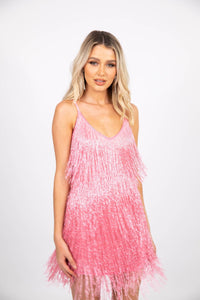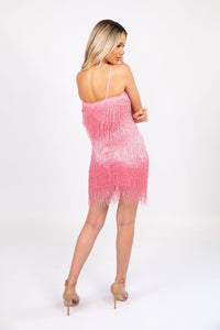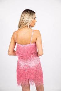 Handmade to perfection, the SALMA mini dress is the latest Limited Edition piece by Noodz Boutique. Hundreds of bright pink beaded strings are individually placed on mesh material to create this eye catching beaded fringing masterpiece. Perfect for the bride to be celebration such as hens night and engagement party as well as birthday party when you want to look extra glam and special.
