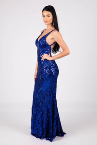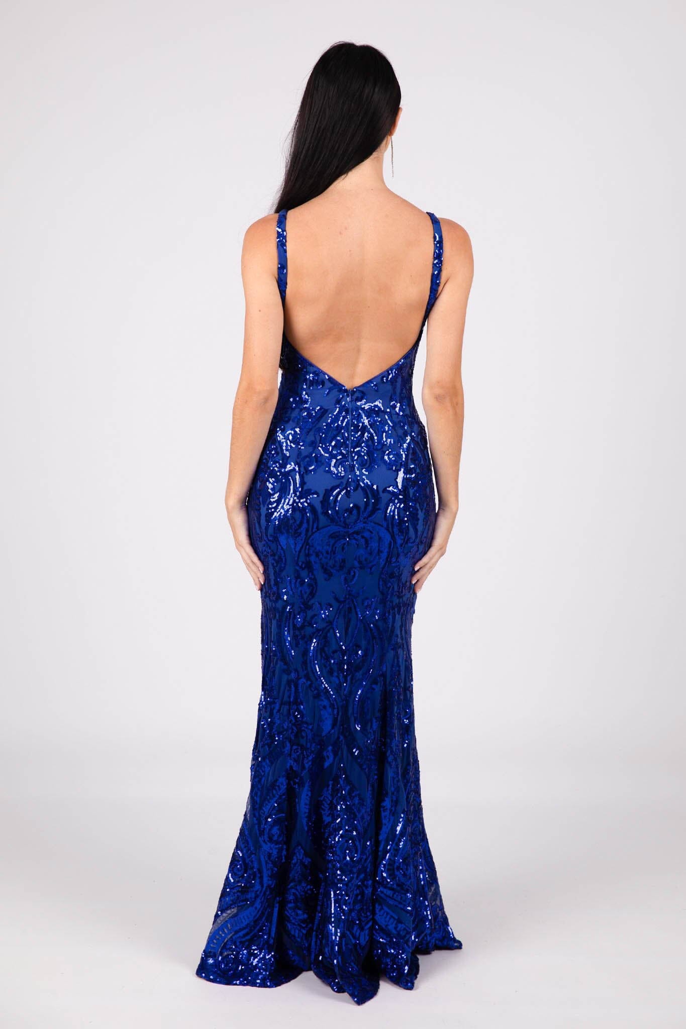 The Seraphine evening gown features embroidered sequins, V plunge neck and an open back design. This fitted evening gown is the perfect head turning piece for your next special event.