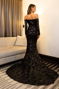The SORAYA sequin evening gown is made from striking vine pattern embroidered sequins in a classic off-the-shoulder neckline and our signature fit & flare mermaid silhouette. Wear with an updo, drop earrings and heels to complete the formal look.