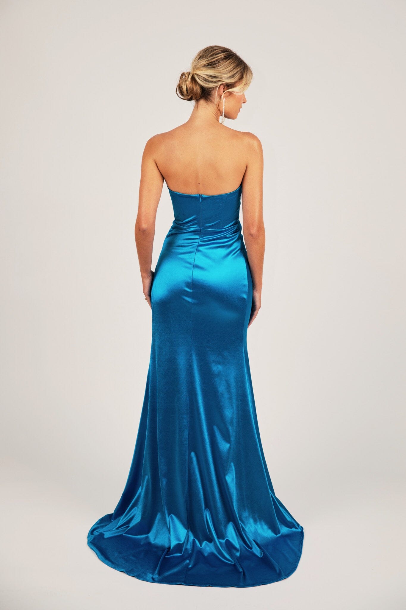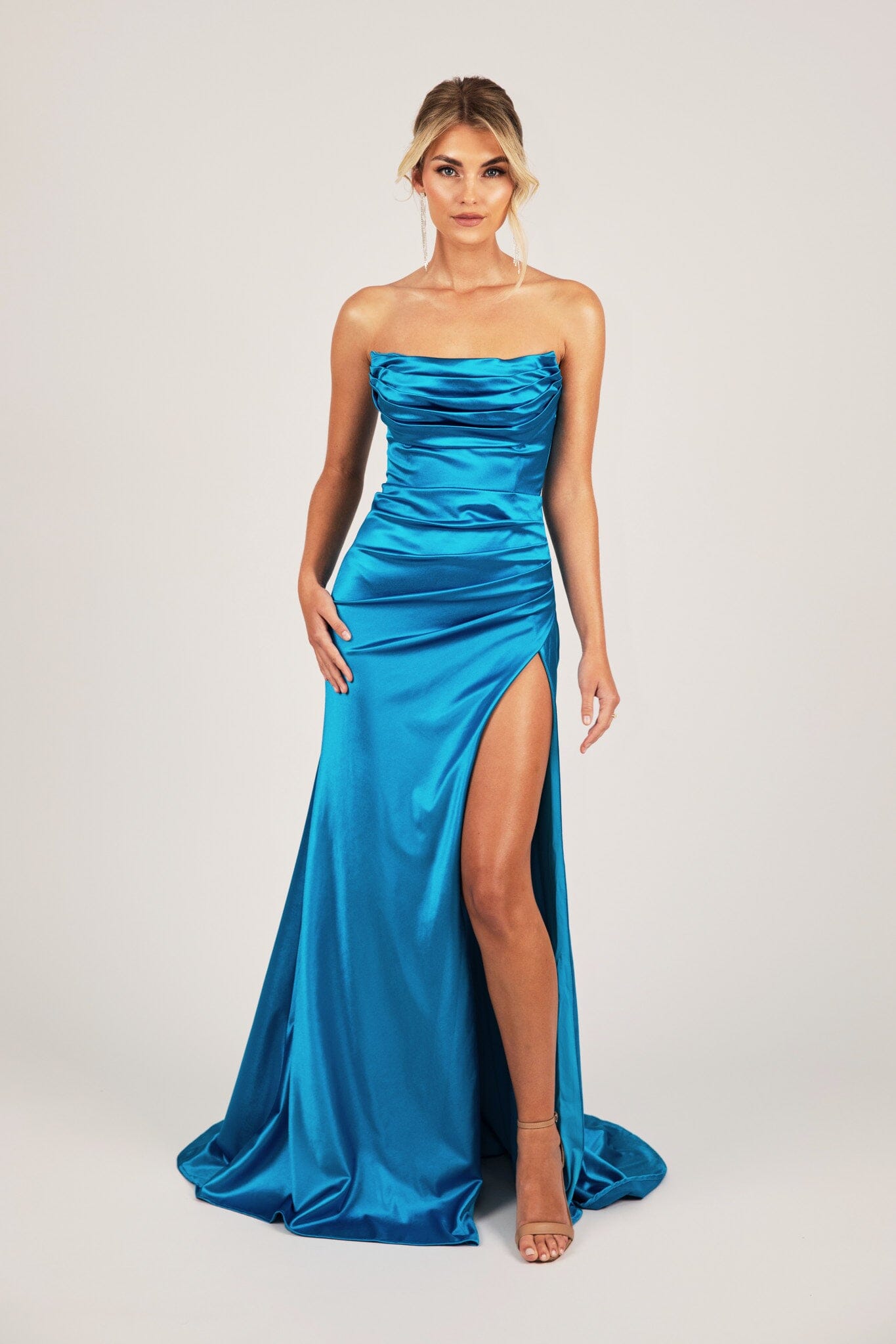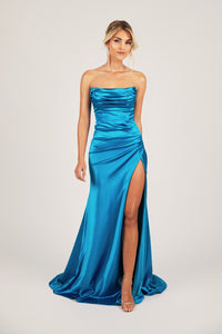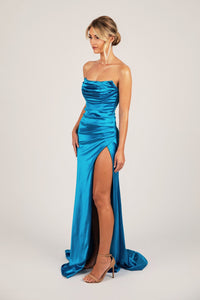 The stunning Zaria formal gown features luxe stretch satin that supports and accentuates your best assets. Featuring sultry bustier neckline and elegant draped detail, a gathered waistline that contours the body and and high slit that elongates the legs. Perfect for school formal, prom or other formal and red carpet events.