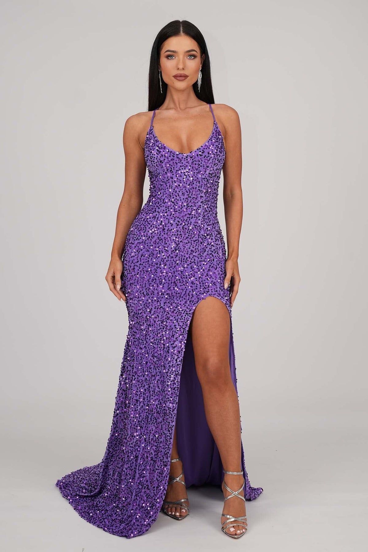 Zelda features sumptuous velvet sequinned fabric, V neckline, adjustable lace up straps on open back, thigh-high side slit, and the most flattering fit and flare silhouette. Slip into this shimmery evening gown to have all eyes on you at prom, school formal or any formal event.