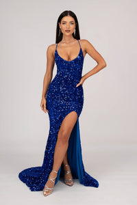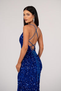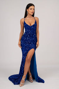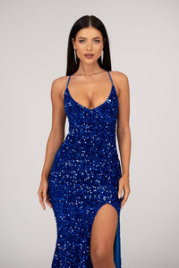 Zelda Side Slit Velvet Sequin Gown - Royal Blue